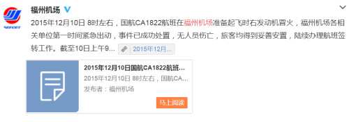 福州至北京一客机起飞时发动机冒火 无人员伤亡