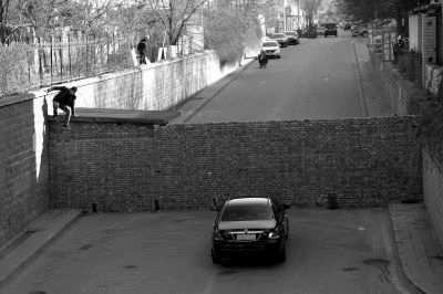 路口被砌了一堵墙,过马路的人只好翻墙。