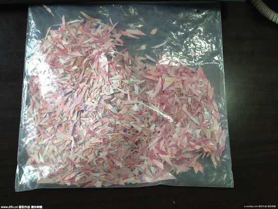 去年10月的一天,陈先生到附近父亲家给老父亲做饭,谁知道陈老汉突然对他说了一句:“对了,我卖房子的钱,你们谁也不用惦记了,我都给剪了!”这下可把陈先生吓得不轻。在父亲的指引下,陈先生看到一个箱子里面全是父亲剪碎的残币!一清点,20万元现金已经剪了14万!陈先生惊呆了!陈先生告诉记者:“当时别提心里多堵了,那一张张百元大钞都被剪成几十块,而且混在一起,根本没法复原!”日夜拼接三个月复原1080张钞票可是陈先生夫妇并没有绝望,他们第一时间将残币带去银行,询问银行如何才能将残币兑换成整币。[!--empirenews.page--]