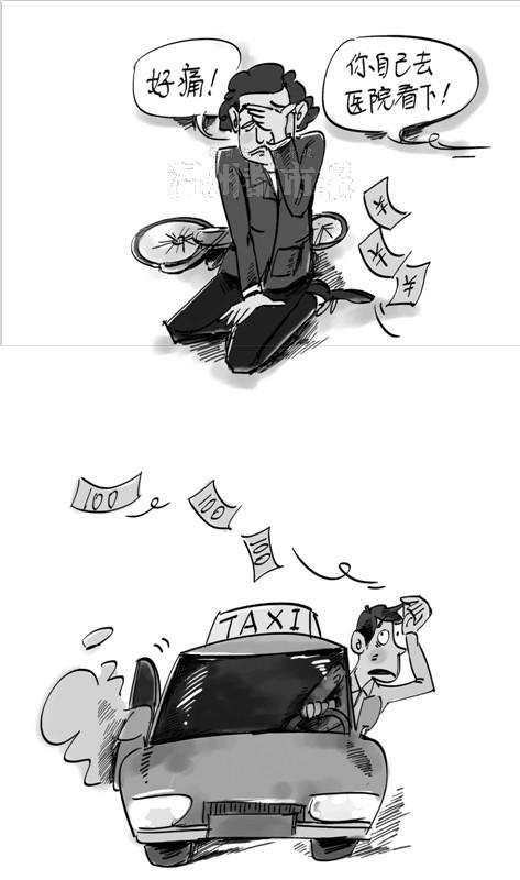 1月20日晚7时25分许,正下着阵阵冷雨,一辆出租车沿市区解放街由南向北行驶至开太百货前面时,本来按照规定靠边30厘米才允许停车,但司机还未完全将车子停靠到路边,就迫不及待地让乘客下车,乘客顺手推开的后车门,“呯”地一下,碰到了同方向骑行的一辆自行车,致使骑车人的左眼部位受伤。事故发生后,出租车司机掏出300元交给伤者,轻描淡写地说:“你自己去医院看一下。”说完就驾车走了。