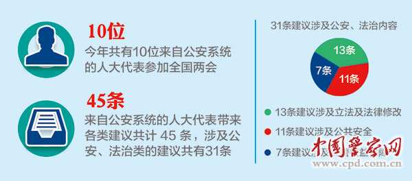 据人民公安报、中国警察网记者统计,今年共有10位来自公安系统的代表参加全国两会,其中包括首次在全国两会中亮相的全国人大代表、浙江省公安厅厅长徐加爱。他们今年共带来各类建议共计45条,其中,涉及公安、法治类的建议共有31条。在这31条建议中,又有13条建议与立法及法律修改有关,堪称公安代表们点击率最火的议题。