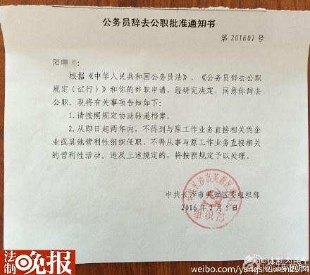 今日上午,法晚记者通过湖南省长沙市芙蓉区人民法院了解到,2015年12月12日,湖南省长沙市芙蓉区人民法院一姓阳的法官提交了辞职信,在今年2月5日,湖南省长沙市芙蓉区委组织部批准其辞去公职。