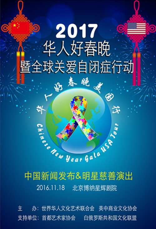 2016年11月18日,由中国文化管理协会社文委、世界华人文化艺术联合会和美中商业文化协会共同主办,世华艺联(北京)文化发展有限公司和昊天阳创世国际文化传媒(北京)有限公司联合承办的“2017华人好春晚走进美国暨全球关爱自闭症行动”新闻发布会及明星公益演出在北京博纳星辉剧院隆重举行。