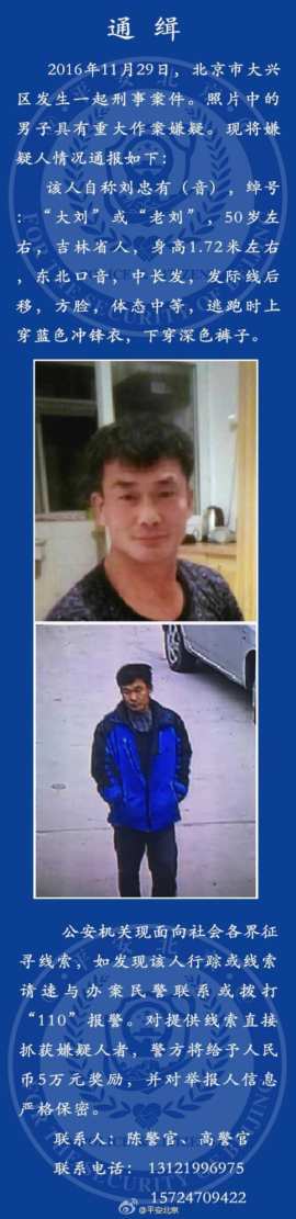 北京大兴发生一起刑事案件 警方悬赏5万通缉