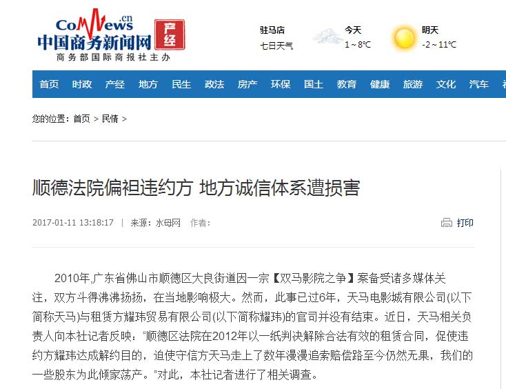 2010年,广东省佛山市顺德区大良街道因一宗【双马影院之争】案备受诸多媒体关注,双方斗得沸沸扬扬,在当地影响极大。然而,此事已过6年,天马电影城有限公司(以下简称天马)与租赁方耀玮贸易有限公司(以下简称耀玮)的官司并没有结束。近日,天马相关负责人向本社记者反映:“顺德区法院在2012年以一纸判决解除合法有效的租赁合同,促使违约方耀玮达成解约目的,迫使守信方天马走上了数年漫漫追索赔偿路至今仍然无果,我们的一些股东为此倾家荡产。”对此,本社记者进行了相关调查。