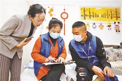 11月1日,连云港市连云区墟沟街道的普查员李莎(中)通过手机人口信息采集系统现场登记供图/新华社
