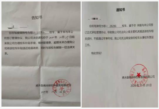 只要是佛持保公司想从司机那里榨取的利益没有如愿,他们就动辄威胁、恐吓司机,要么强迫校车退出公司,要么发书面《告知书》或《通知书》,让校车停运,居高临下,态度恶劣。